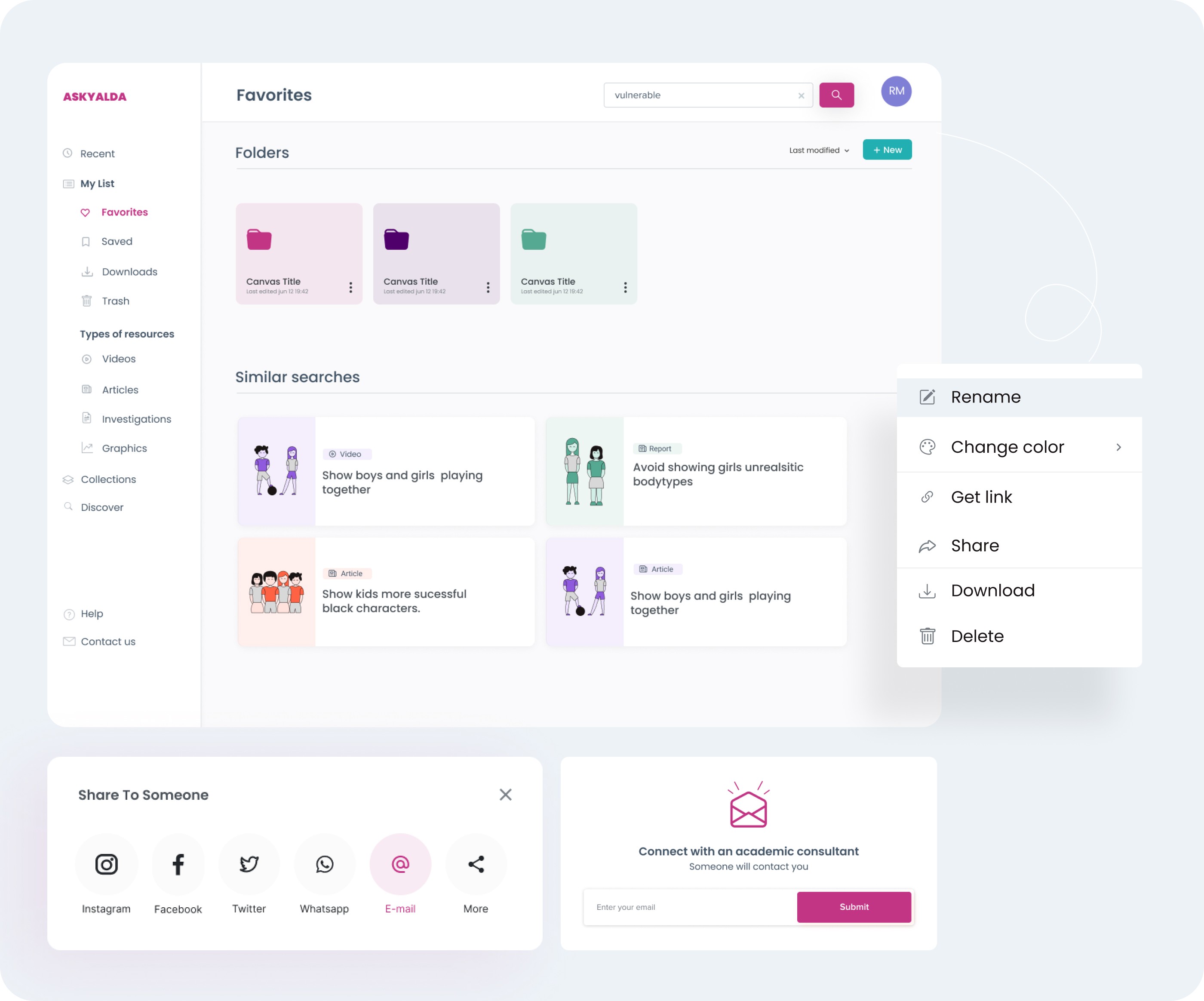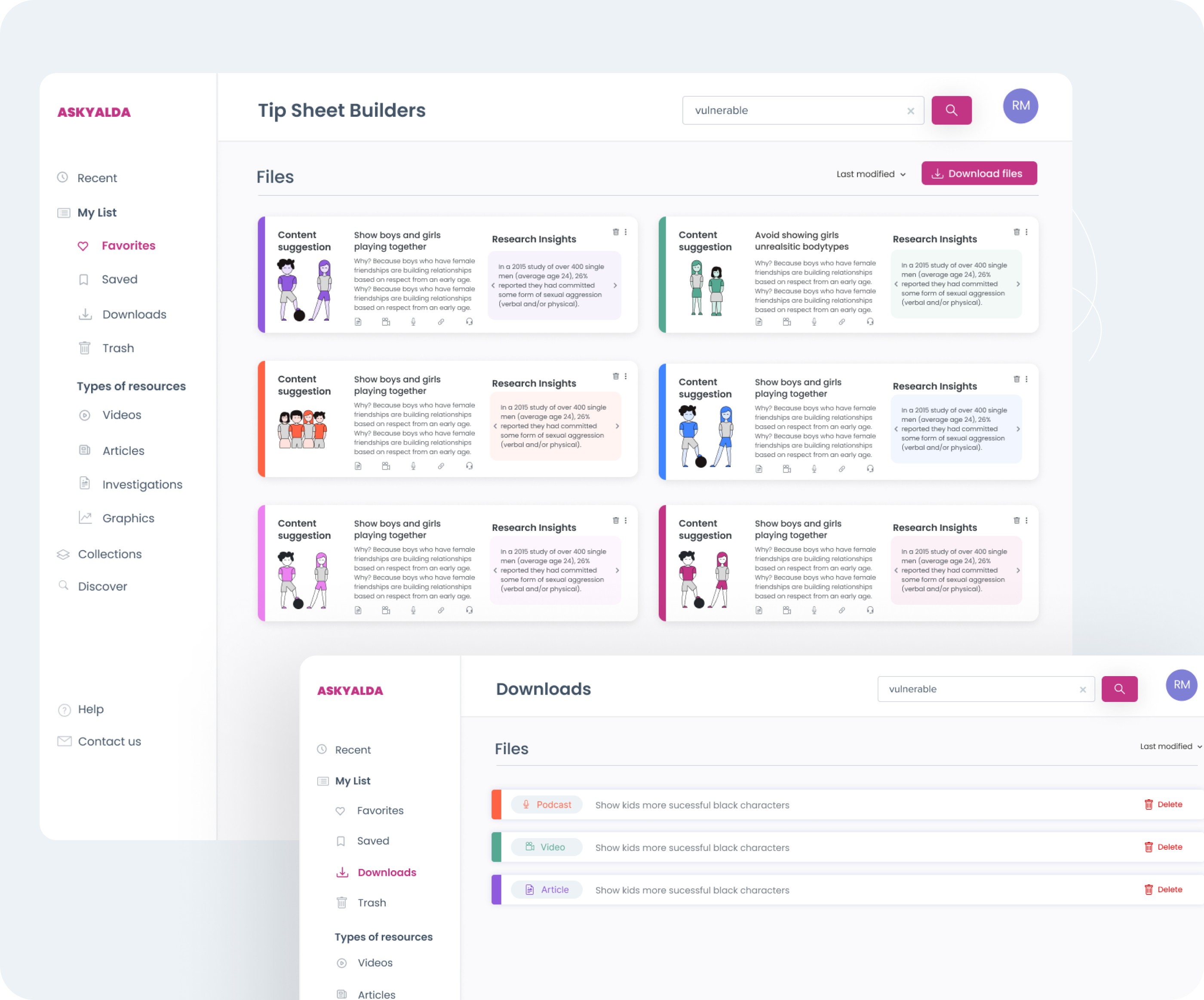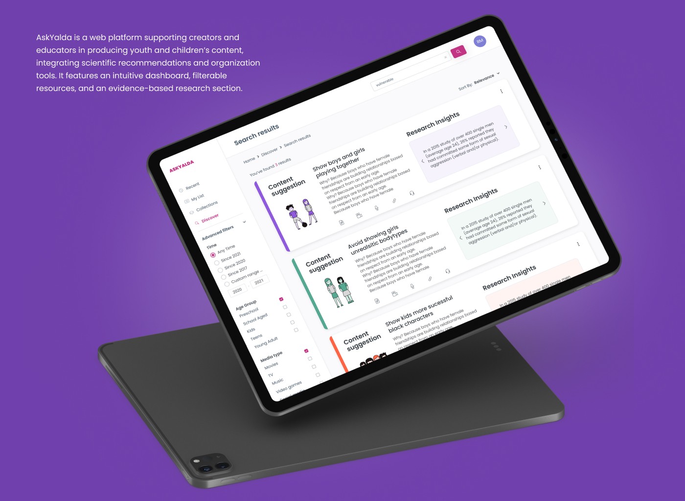 Diseño UX/UI completo de dashboard para AskYalda, plataforma web que ayuda a creadores y educadores a producir contenido para niños y jóvenes. Scope total: arquitectura de información, wireframes, prototipos interactivos, guía de estilos y componentes, diseño visual e ilustración de personajes en Adobe Illustrator. Herramientas: Figma, Adobe Illustrator.