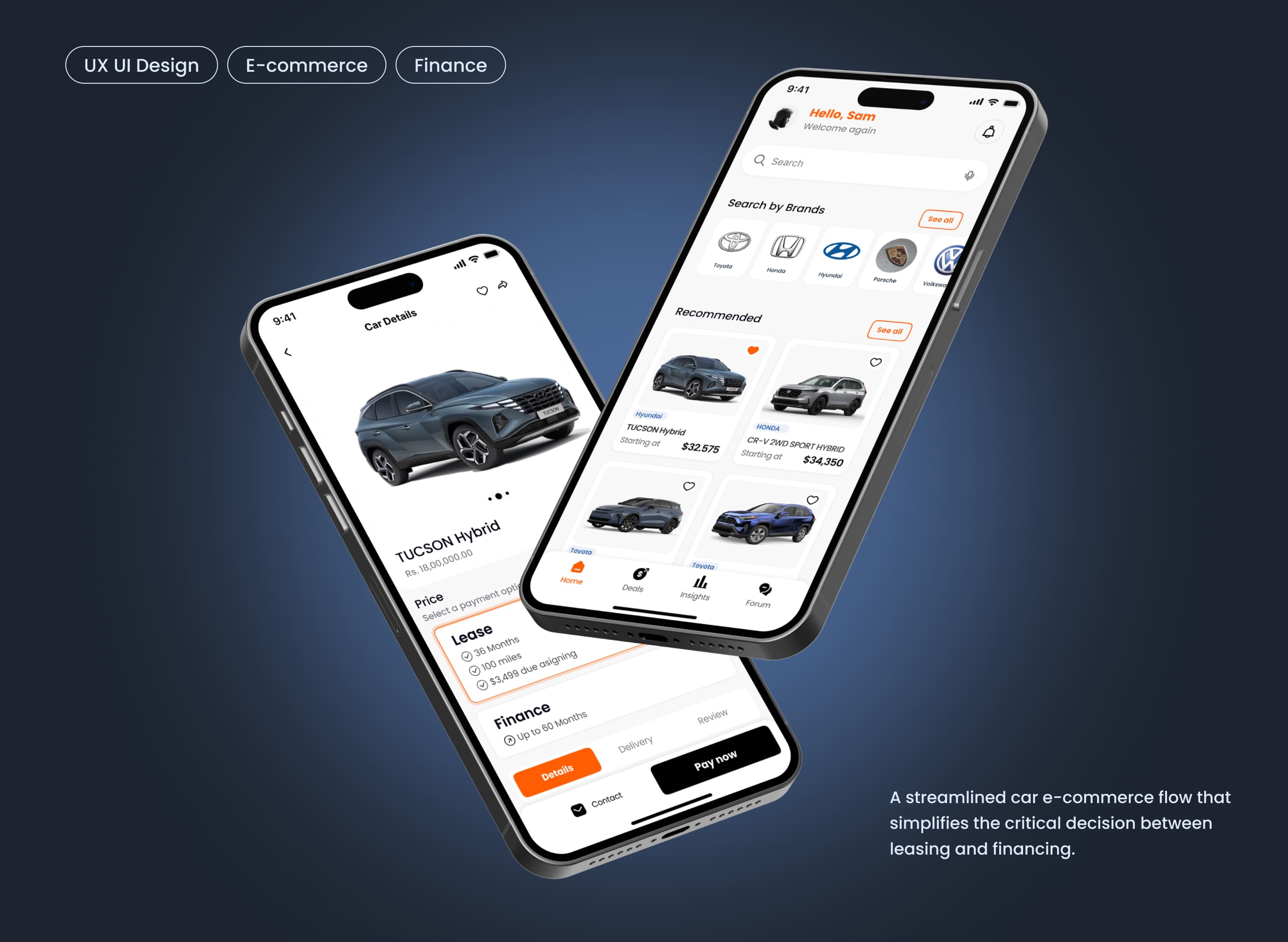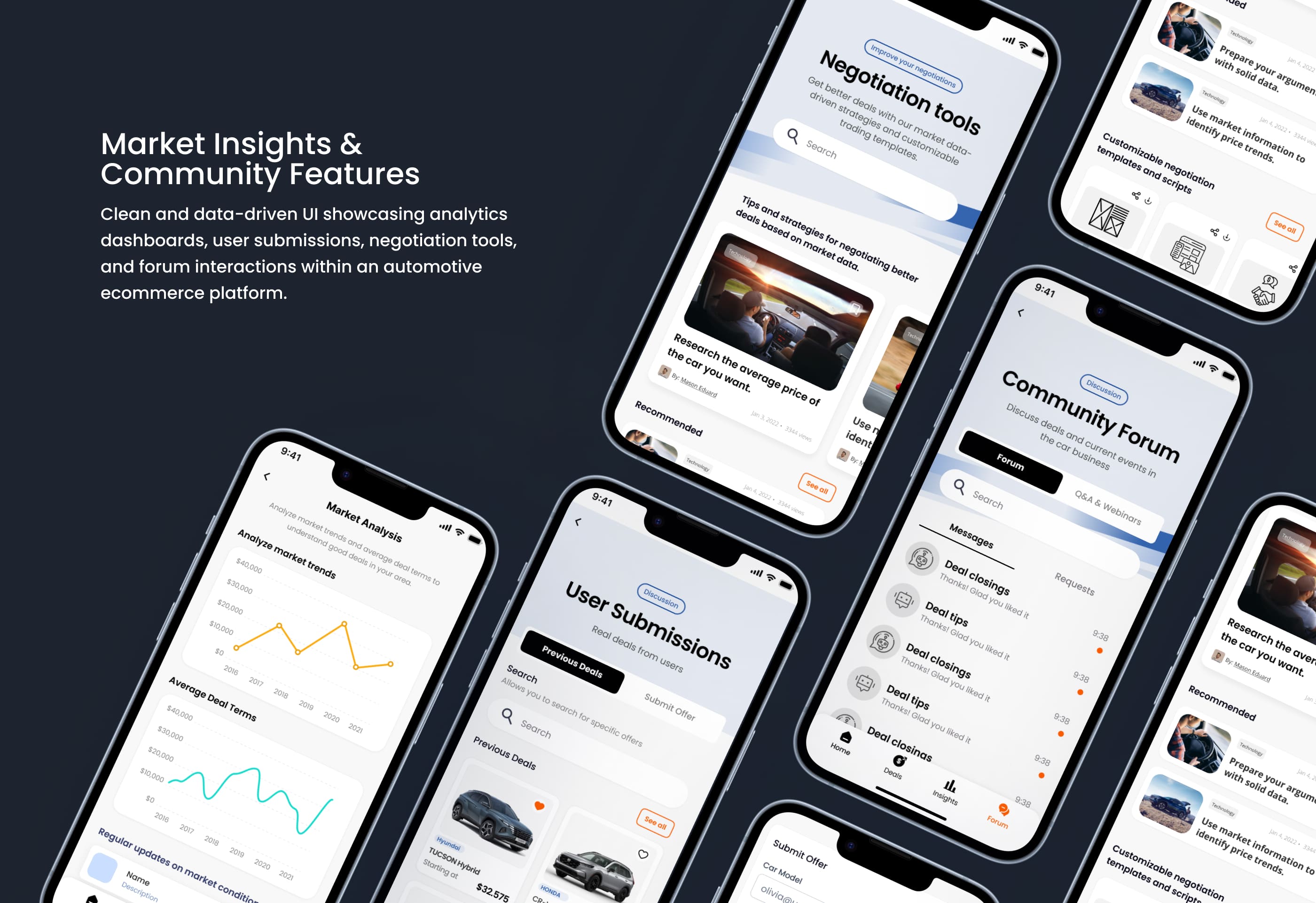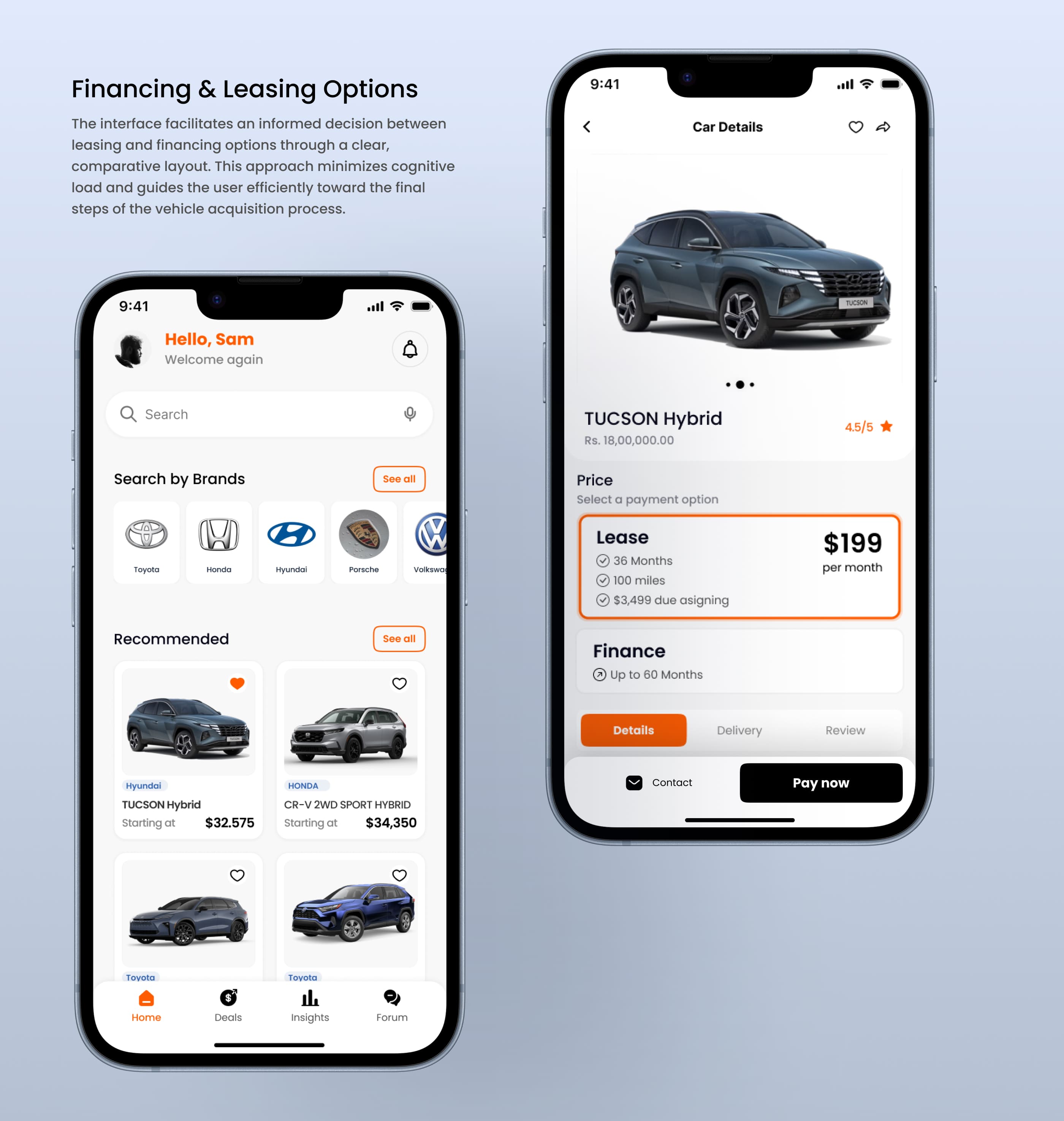 Wheel Deal transforma la compra de autos usados en una experiencia fluida y data-driven. Esta app de e-commerce integra búsqueda por marcas como Toyota, Hyundai y Volkswagen, recomendaciones personalizadas, herramientas de negociación y opciones de financiamiento o leasing en un flujo intuitivo que guía al usuario hasta la decisión final.